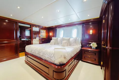 Located forward on the main deck features a king bed with owner's study, vanity table/desk, private his and hers dressing rooms. Dual china sinks, shower with glass doors, marble floors, Kohler bidet. 42" HD LCD TV with surround sound. Samsung Blu Ray DVD/CD player. iPod docking station.