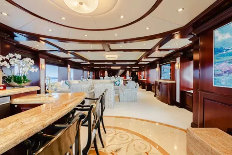 Located aft of the pilothouse featuring a large wet bar with seating for 4, designer Mahogany wall treatment, desk, large settee, fireplace with TV above mantle. Day head located forward.