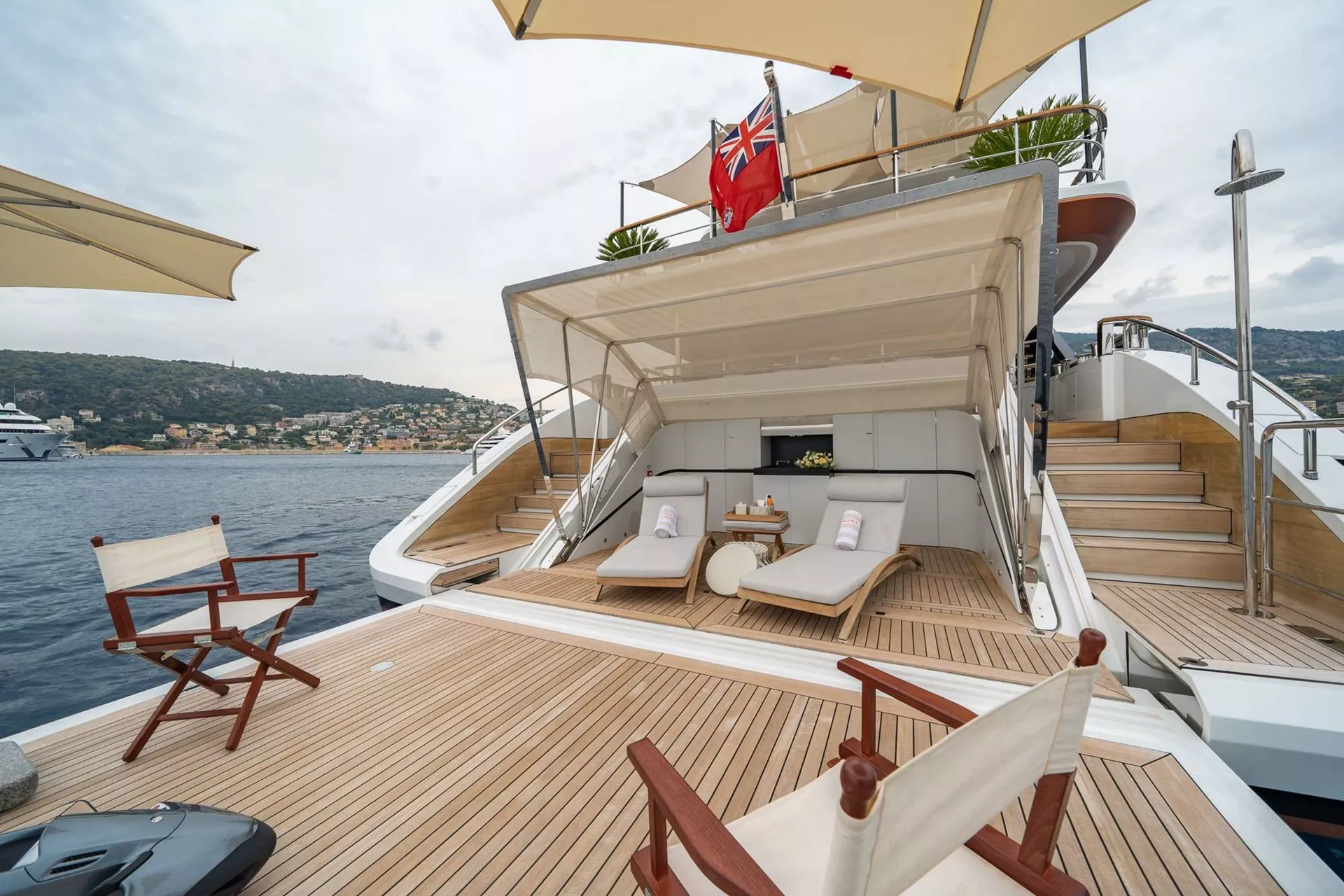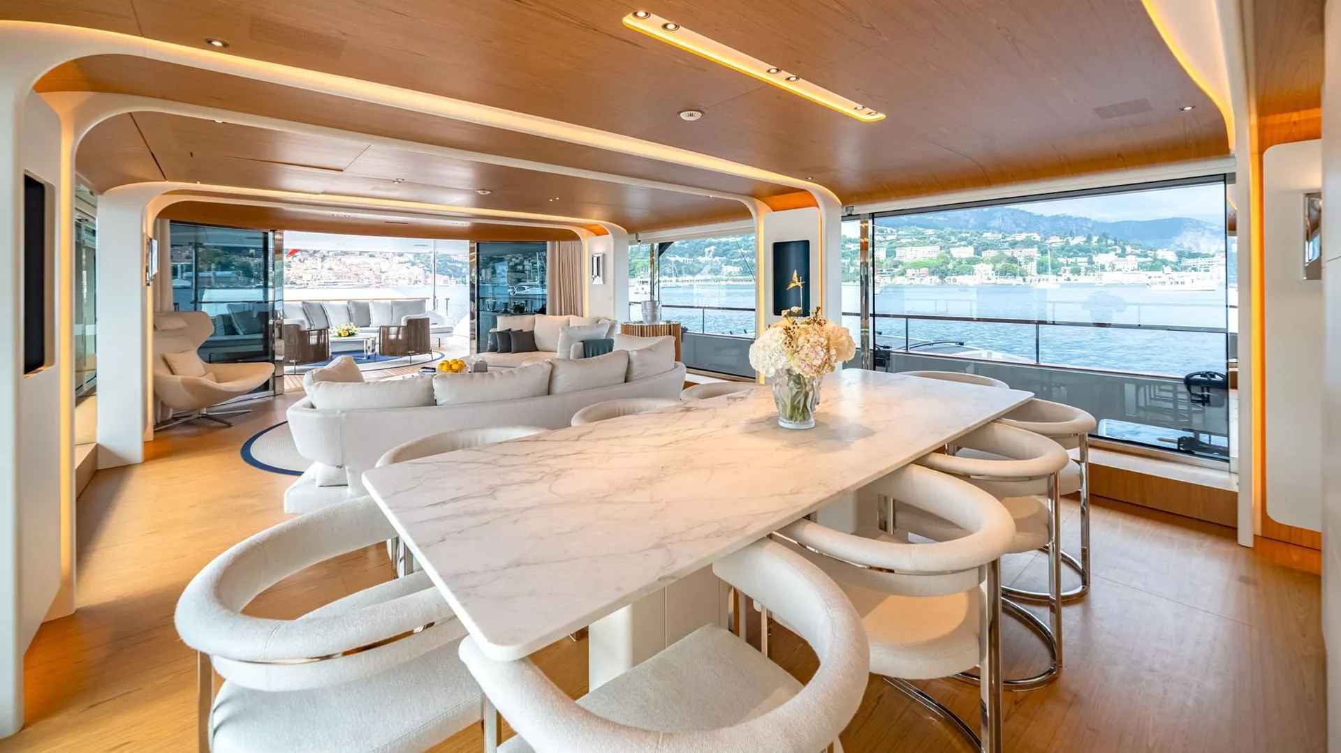 One of her many highlights is the ’cocoon-style’ observation deck that provides an intimate space to enjoy a morning coffee or evening sundowner while taking in sweeping views. The spacious Hamptons-style beach club invites guests to relax in the sun at sea-level and features a retractable fabric canopy providing ample shade when needed; as well as a platform for easy access when enjoying one of the yacht’s broad selection of water toys. Her foredeck outdoor pool lounge is yet another exterior space to soak up the sun, with plush sun pads and a large swimming pool.