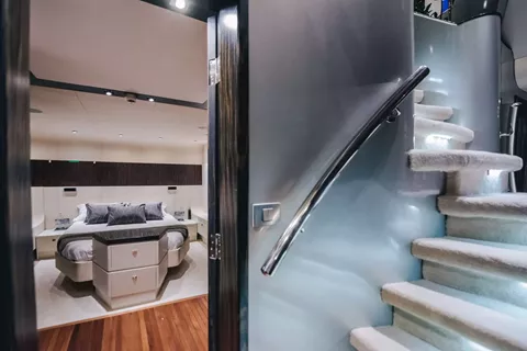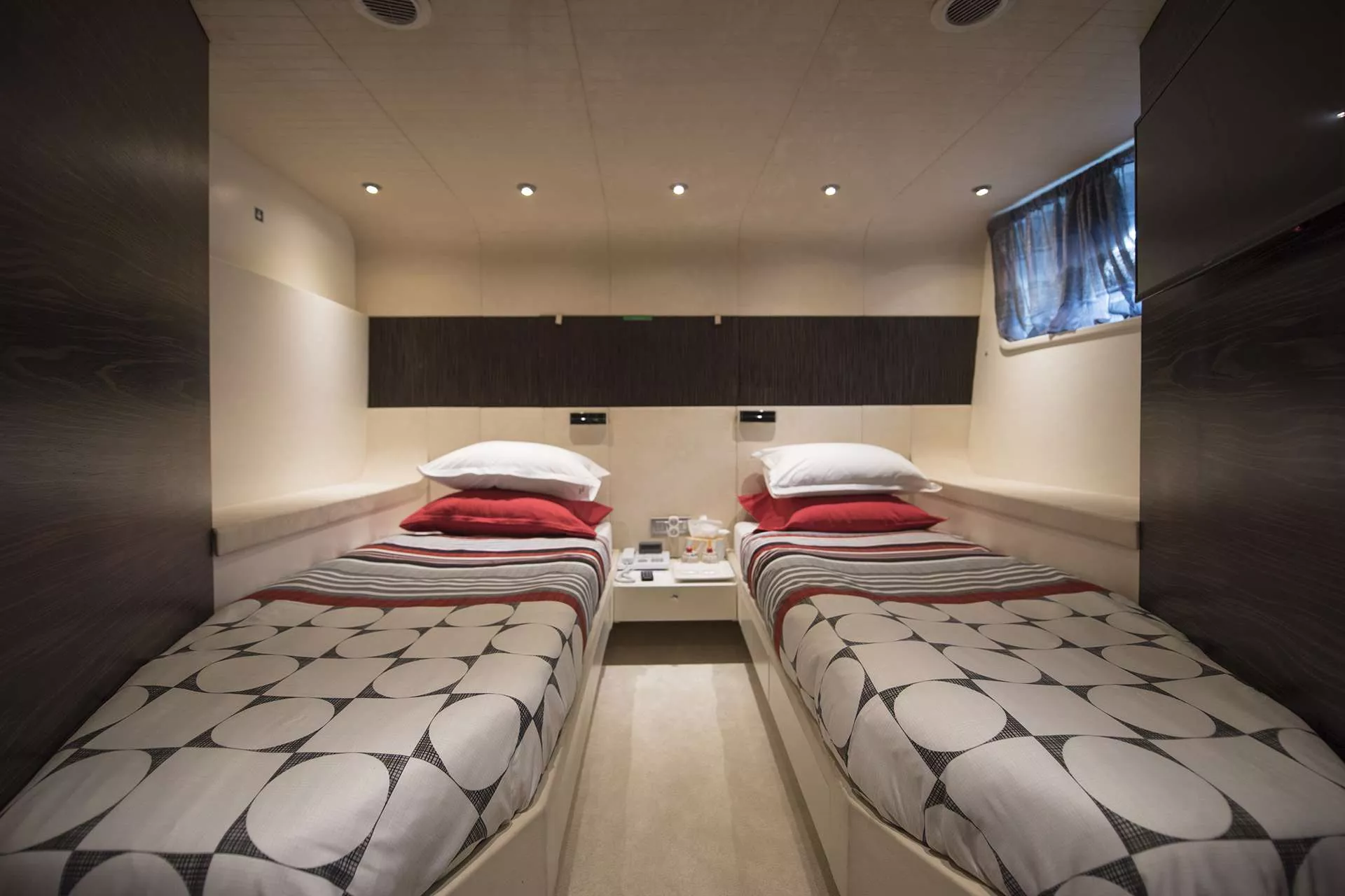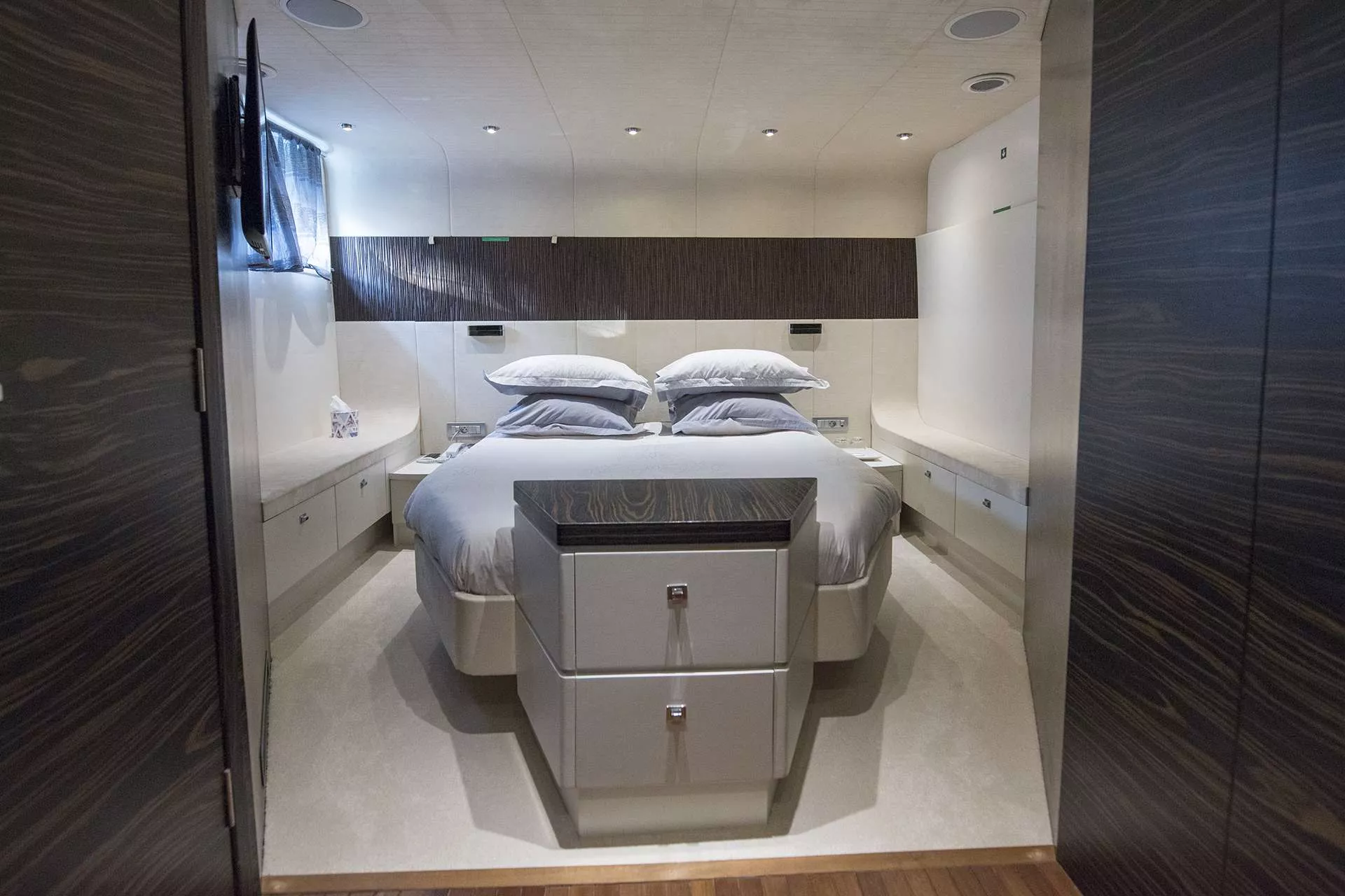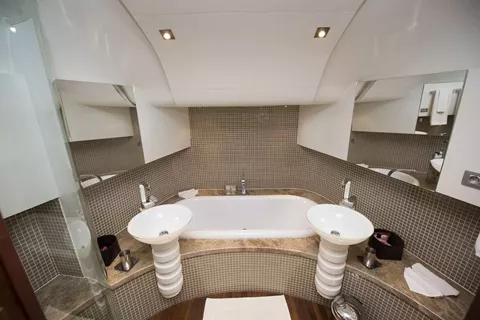Master cabin: Full beam cabin located forward on the main deck, very bright with large windows. The cabin is equipped with a king sized bed, a desk, electric blinds, large flat screen TV and a nice size closet. The ensuite sunken bathroom has a shower, bath tub and twin basins.