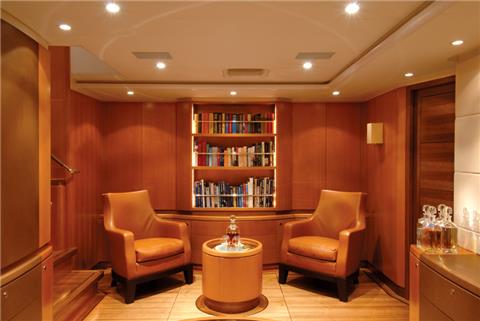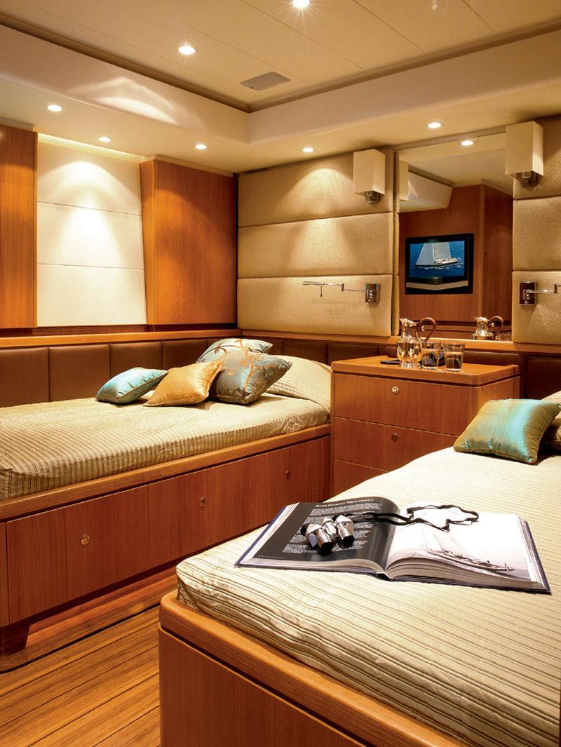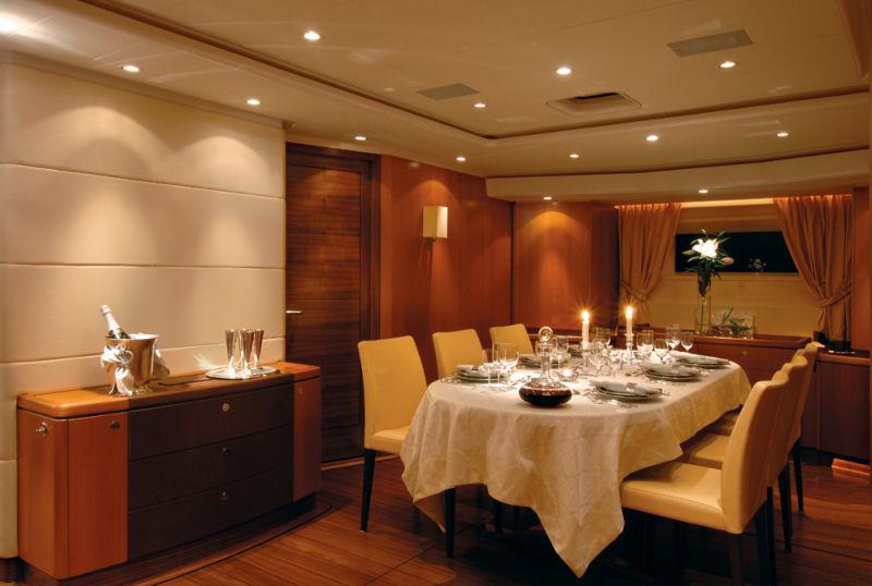 The raised saloon allows natural outdoor light to illuminate the entire room with panoramic views. She is decorated with walnut floors, warm brown leather sofas and polished wood walls. The dining area, the full width of the yacht, seats guests in great comfort and style. Every detail has been attended to from Baccarat crystal-ware, hand painted Bernardaud china to Christolfe silverware.