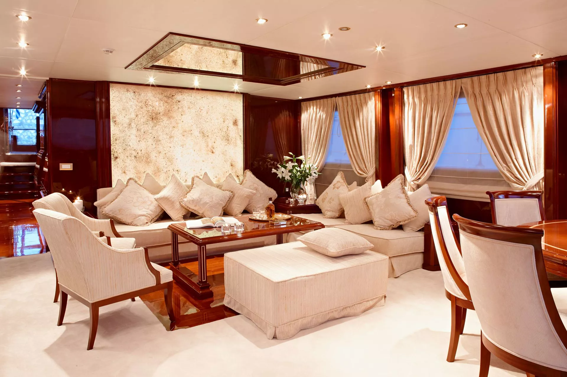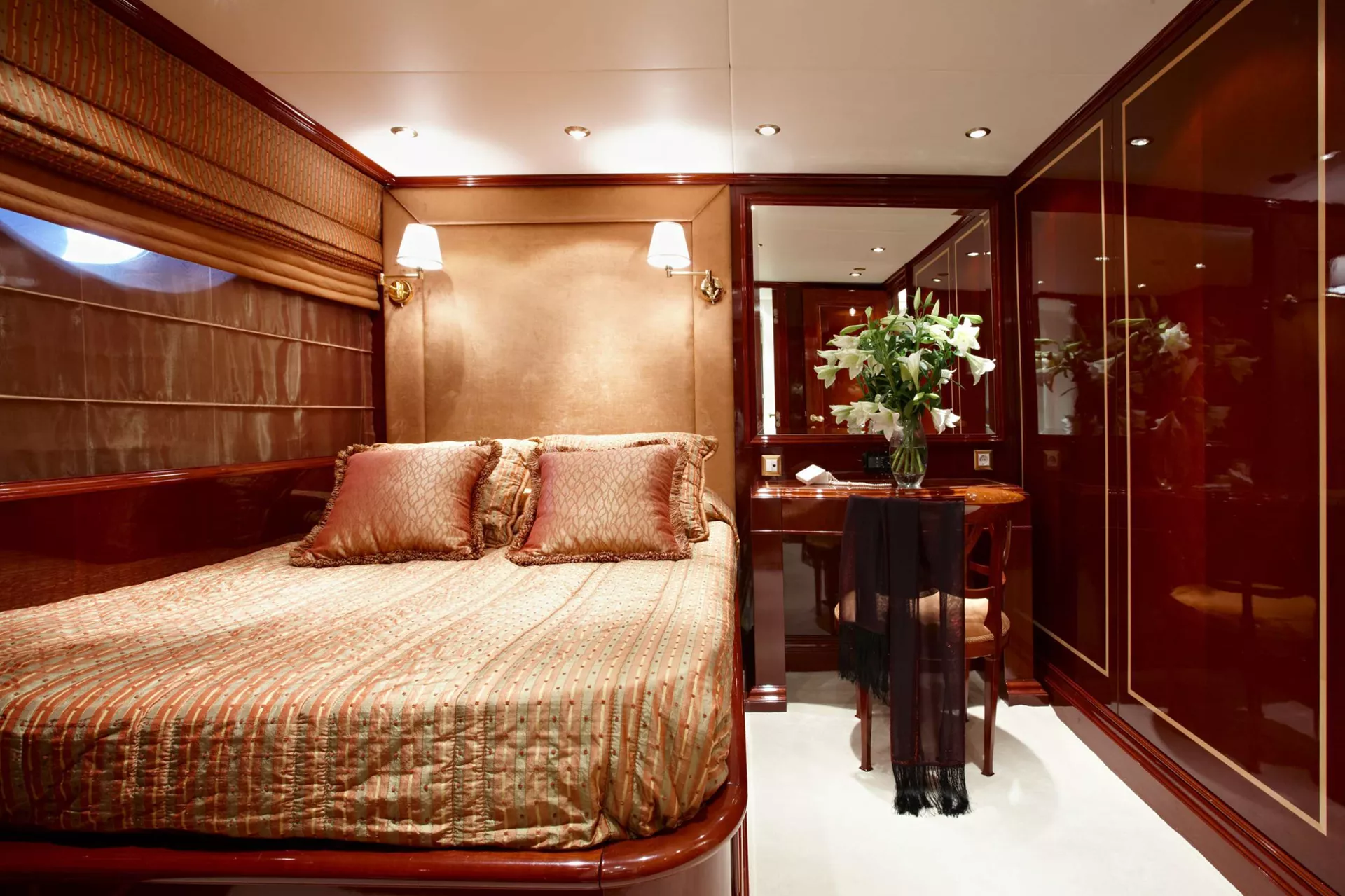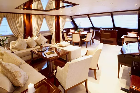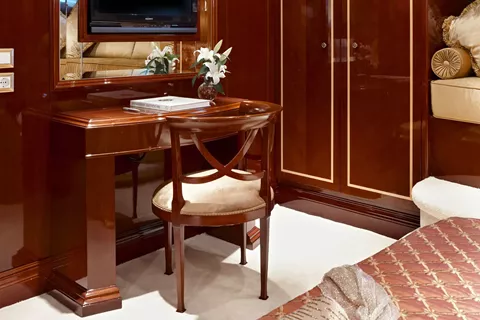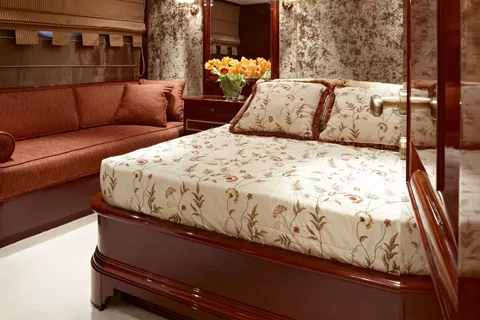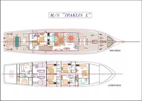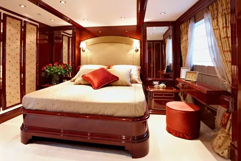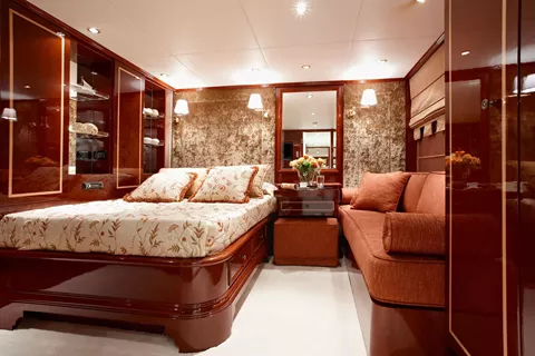 One Master cabin, one VIP cabin, two cabins with double bed plus a single bed/sofa each, one cabin with double bed, and one cabin with twin beds. All cabins have en suite facilities, TV, DVD, CD and MP3 players.