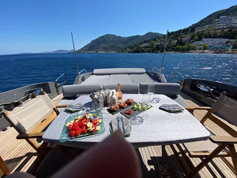 This 86ft /26,20m motor yacht was built in 2005 by Azimut and lastly refitted in 2022. She can accommodate up to eight guests in her four elegant en-suite cabins. Perfect choice for Ionian charters as she is based in Corfu. She offers a vast variety of water toys including Tender ZODIAC PROJET 350, Seabob, Water Skis Adult, Snorkeling Equipment, Tubes, Banana, 2 stand up Paddles, 2 Sea Scooters Aqua (and Jet Ski Sea-Doo Spark upon request). Her four crew members will do every effort to meet all your wishes.