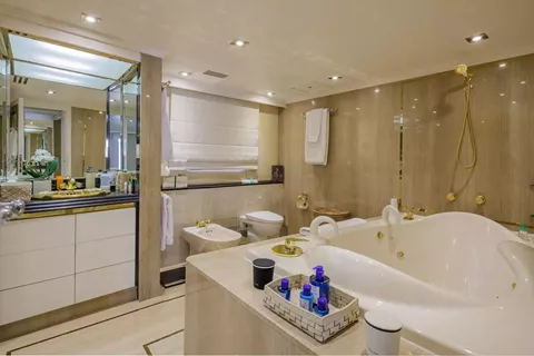 A Master Suite with a super king size bed (1.85m*2.05m) with a Wardrobe cabin and ensuite facilities (bathtub/jacuzzi & shower)