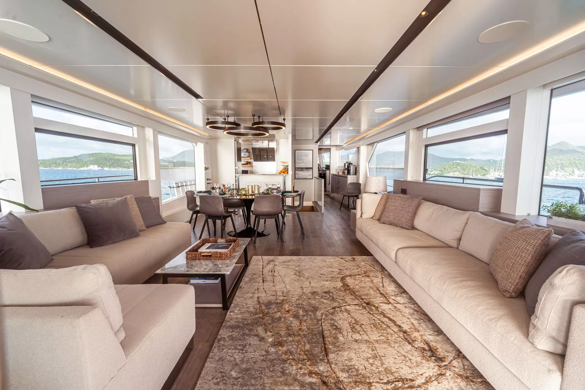 Throughout the yacht, guests will discover inviting spaces designed for relaxation and entertainment. Main salon is versatile space, ideal for both intimate gatherings and lively socializing, showcasing an exquisite design, featuring elegant furnishings, and tasteful accents that create a sense of timeless beauty. Adjacent to the Main Salon is the dining area, where culinary delights await.