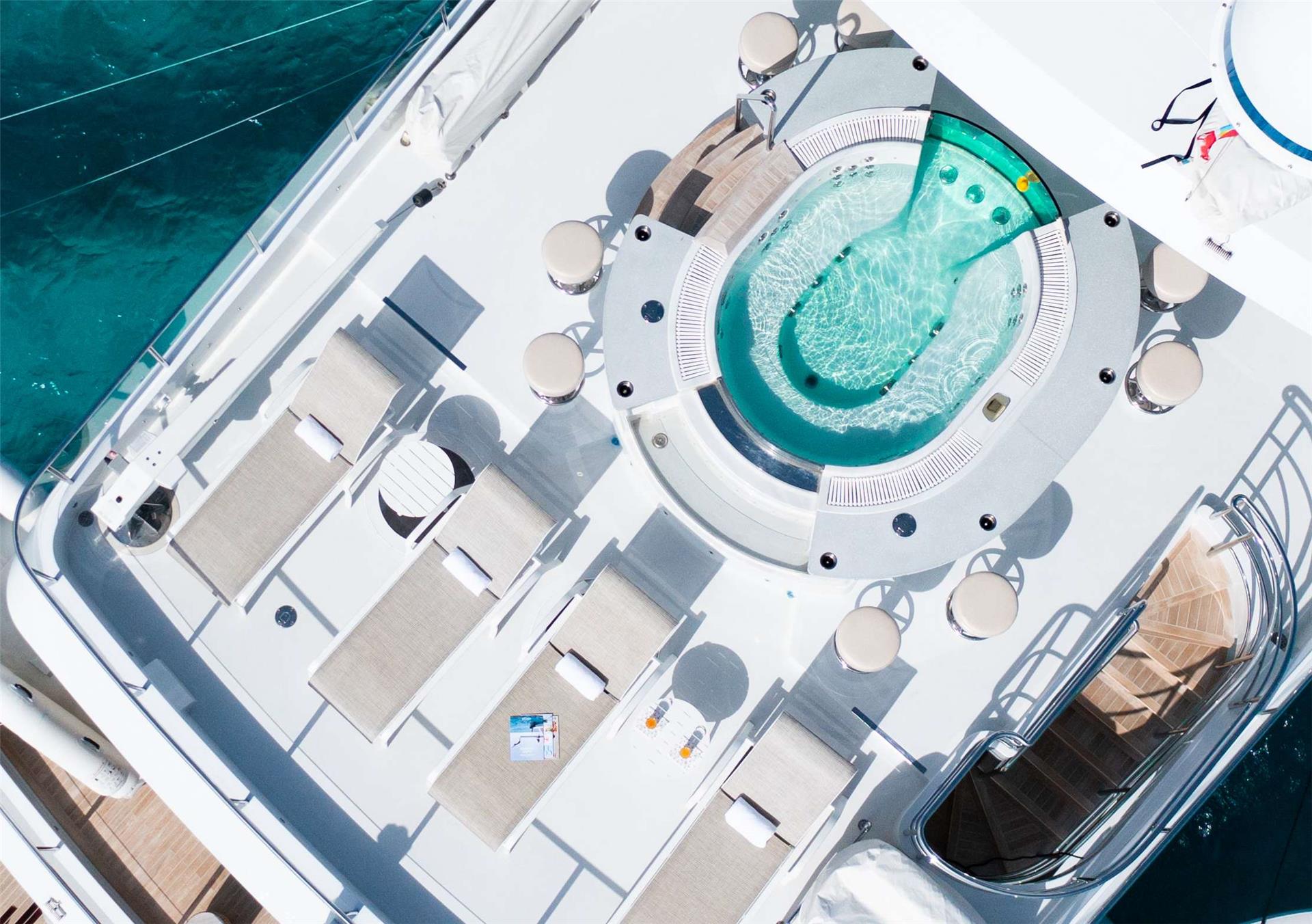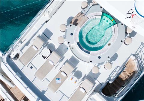 Sundeck has a jacuzzi with a waterfall feature. A setting enables the deck space aft of the jacuzzi to be filled with water and turned into a splash pool for children or an area where adults may relax and suntan whilst being semi - submerged in water.
