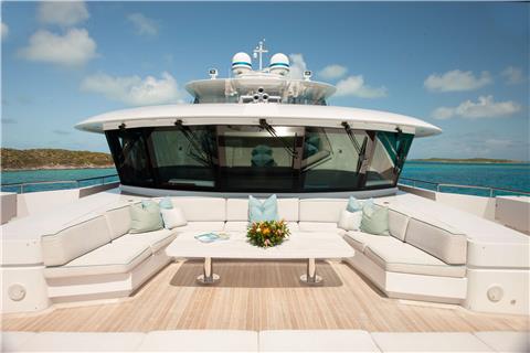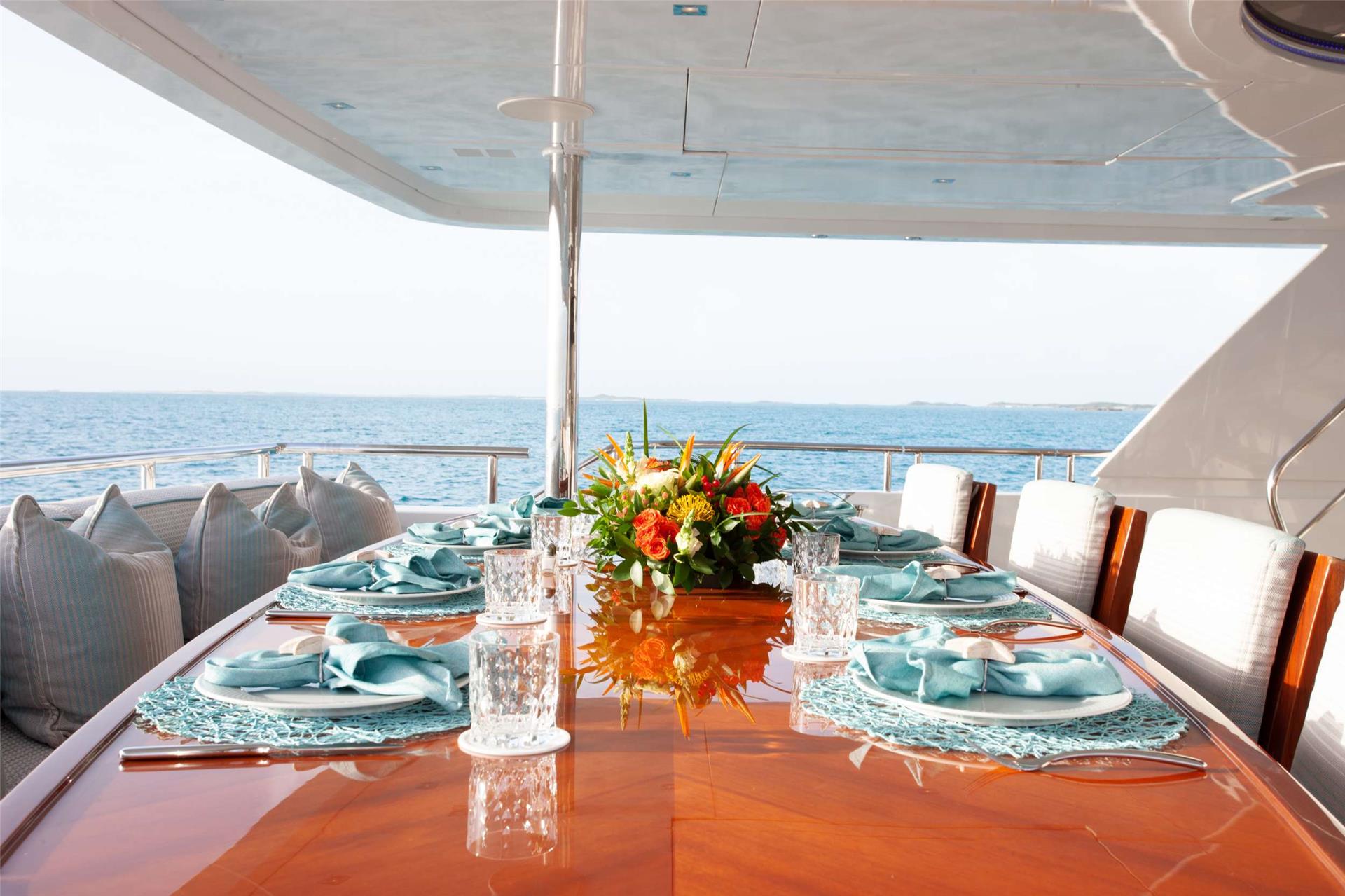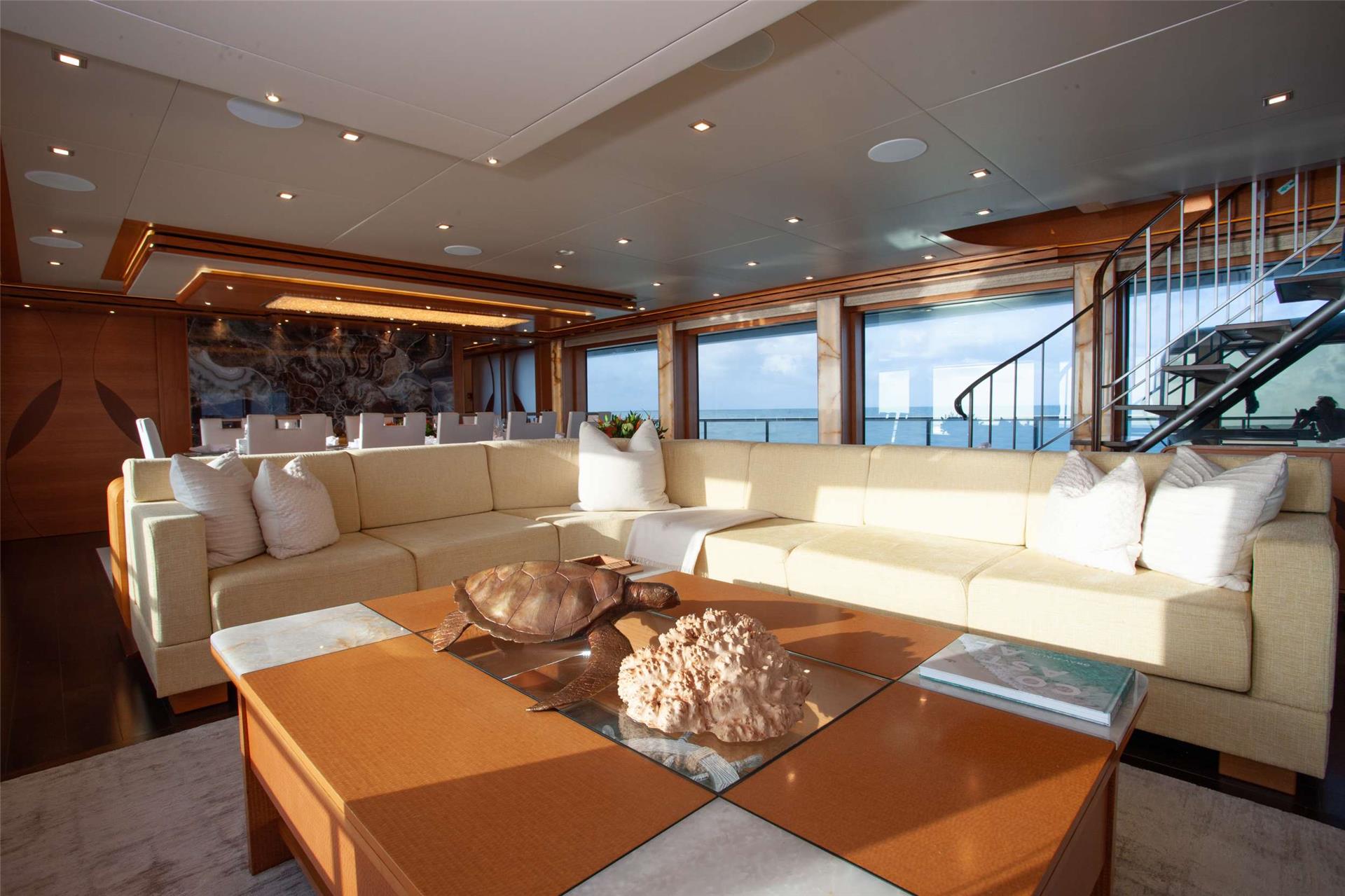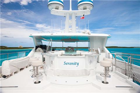 Sporting new interior furnishings and artwork following a 2023 refit, Serenity's interior offers versatile spaces for relaxing and socializing with ambient lighting able to set any tone. The main saloon is open plan to the formal dining table, and doors lead to an inviting aft deck with statement bar counter. Ascending to the deck above, a second skylounge features a large L-shape sofa, coffee table and cocktail bar.