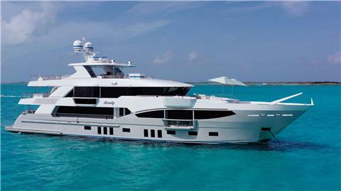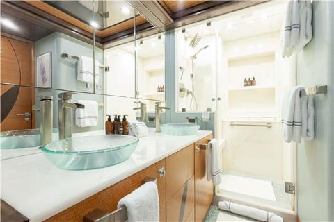 Serenity has accommodation for 12 guests in a cabin arrangement that comprises five doubles and one which is convertible between twin or double setup. The master suite resides on the main deck and benefits from his-and-hers ensuites as well as two private balconies, and there’s a generously sized VIP suite on the upper deck.
