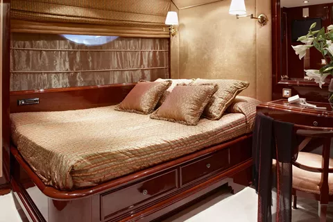 One Master cabin, one VIP cabin, two cabins with double bed plus a single bed/sofa each, one cabin with double bed, and one cabin with twin beds. All cabins have en suite facilities, TV, DVD, CD and MP3 players.