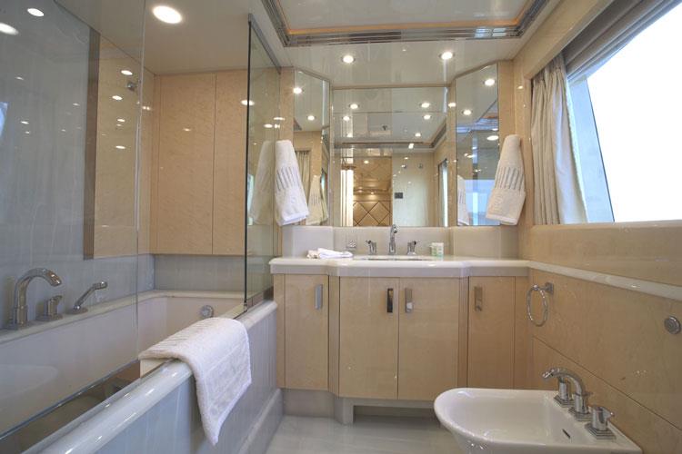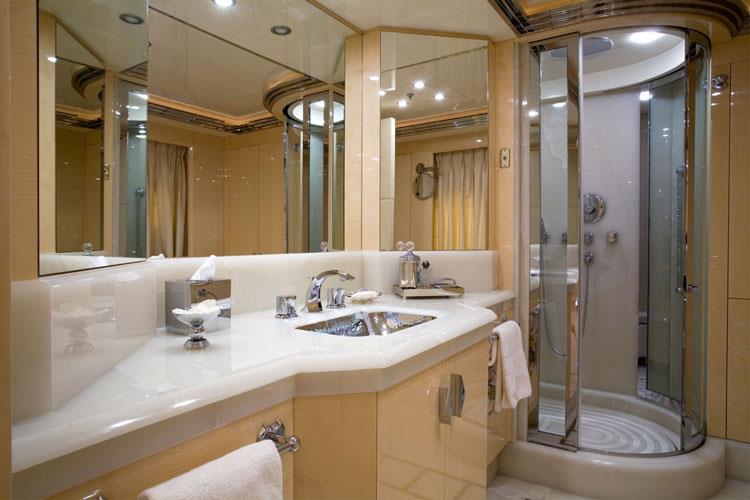 Here the ambience becomes instantly warmer and less formal; off white leather panels and 4 stainless steel women figures custom made by Schmidt, Paris, representing the four seasons on the walls. Reminiscent of Botticellis’ The Birth of Venus, the naked female figure in each panel, is seto on a background of waves and sealife. Unusual free-standing lamps and false consoles bring a note of elegance. His and Hers bathrooms are located to the sides of the main cabin. They too echo the theme of with white onyx with geometrical patterns, Her bathroom is particularly elegant, featuring metallic women’s figures on the marble walls. A grand stair case facing the bed brings you into a unique private sitting area with panoramic views. A perfect private heaven onboard where you can enjoy a book, look at the sky, listen to music, or even watch TV (from a well hidden Plasma screen) while crossing the seas.
