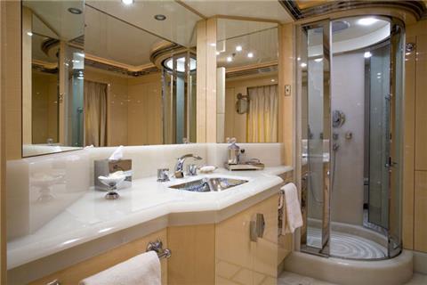 When Sunday is alongside, a starboard gangway midships channels the guests directly in to the main deck entrance hall. From here the Owners’ suite is forward and the main saloon aft. A wide staircase curves down to the main guest accommodation and crew quarters on the lower deck and up to the Vip cabin and a second, informal saloon on the upper deck. The hallway is uncluttered, dominated by a voluptuous glass female torso. On into the foyer one meets the continuation of the onyx floor patterned with the geometrical and circular stainless steel partners. The same idea follows into the guest powder room with stainless steel flowers engraved on to the white onyx walls.