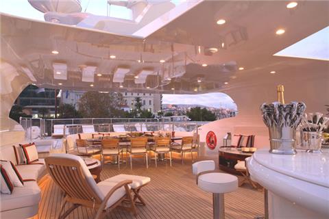 Guests can reach the bathing platform along a starboard companionway from the aft deck and board the tenders, swim or shelter from the sun beneath two umbrellas slotted into the teak decking.