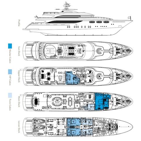 Yacht Charter Description M/Y O’NEIRO is a 52.7 m launched in 2007. O’NEIRO is available for East Mediterranean charters in Greece and Turkey. She is able to accommodate up to 14 guests is absolute luxury. One owner's suite on the main deck with king size bed, en suite bathroom including Jacuzzi, shower room and walk in wardrobe. One VIP guest suite on the upper deck with king size bed including en-suite bathroom with Jacuzzi and shower room. Two VIP guest suites ARE on the lower deck including en suite bathroom with Jacuzzi. Two twin guest cabins with en suite bathroom, and one twin guest suite on the main deck with en suite bathroom. All three twin cabins have an extra pullman bunk. This luxury yacht offers large tastefully decorated spaces with modern interior and exterior design. On O’NEIRO all staterooms and salons are fitted with Plasma Monitors and Home Theatre systems. She offers a comprehensive selection of water toys. She is a fantastic luxury yacht and an ideal way to explore the wonderful East Med. On board O’Neiro, meaning “Dream” in Greek, the extravagant salon instantly captivates you, with her firm oak and maple floors and elegant rug accompanying her exquisite furniture all surrounded by zebrano wood and wonderful windows giving ample light. For your viewing pleasure at the end of the salon and separating the dining area, is a forty two inch flat screen plasma TV which is discretely placed in a “fit-in” cabinet and appears with the touch of a button. O’Neiro’s dining area seats twelve guests who will savor the delicious gourmet dishes prepared by their distinguished Chef and served by their elite crew. To the left of the dining area is the entrance to the kitchen, at the right of the dining area is the entrance to the Master cabin. Prior to entering the Master cabin, on your left hand side is a stair-case leading down to the rest of the cabins. On your right hand side, you will find a door allowing embarkation and disembarkation of passenger from her starboard side. Immediately after walking past this door, you will find a day head to assist guests. After the day head, there is a stair-case leading up to the VIP cabin, Salon and Bridge and Twin cabins with Pullman berth, en-suite facilities with one water basin and shower, Satellite TV, DVD, CD and Stereo System, Air-conditioning and heating. The third Twin cabin on motor yacht O’Neiro is identical to the other two Twin cabins and is located on the main deck prior to the Master cabin. Yacht Charter Accommodation Number of cabins: 7 Cabin configuration: 4 Double, 3 Twin Number of guests: 14 Yacht Charter Specifications Type/Year: Greece Golden Yachts/2007 Beam: 8.97m (29' 5") L.O.A.: 51.89m (170' 3") Crew: 11 Charter Guest: 14 Max Speed: 15 knots Cabins: 7 Engines: 2x MTU 16V2000 M70 Cruise Speed: 12 knots Charter Amenities and Extras Tenders & Toys 1 Luxury 6m tender 1 6m Sports Tender 2 Wave Runners Windsurf Water-skiing, Fishing Equipment, Snorkeling Equipment, Tubes, Banana. Audio Visual Equipment and Deck Facilities All staterooms and salons are fitted with Plasma Monitors and Home Theatre systems Personal Computer – Internet / E-Mail Playstation 2 Book / Video / DVD / PS2 Games Library. Communications Satellite Communication (phone/fax), Satellite TV SSB Transceiver, VHF Radio, Internal Telephones Personal Computer, Internet and E-mail access Autopilot, Color Radar, Echo Sounder.