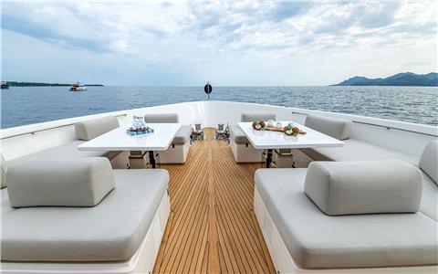 Two additionally fully al fresco areas for dining or cocktail hour socialization are the main deck aft table or the two hi-lo tables on the foredeck which dually convert to a sunpad area. An optional shade can be set up in both areas for those looking to protect from the rays, wind or weather.