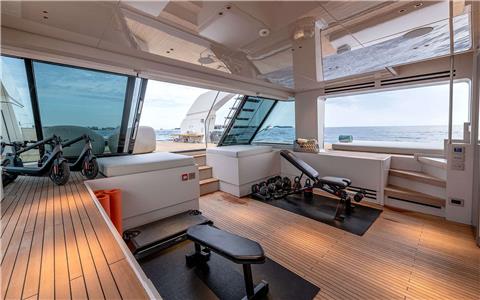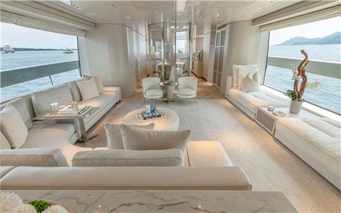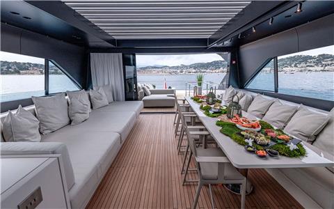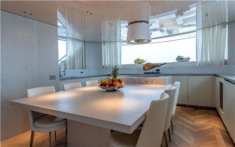 Seamless entry from the aft deck dining into the salon wrapped with seating right up to the large windows for continuous views. Further forward and separated by a central semi-enclosed stairway is the open-plan 'dine in' galley with Hibachi Grill.