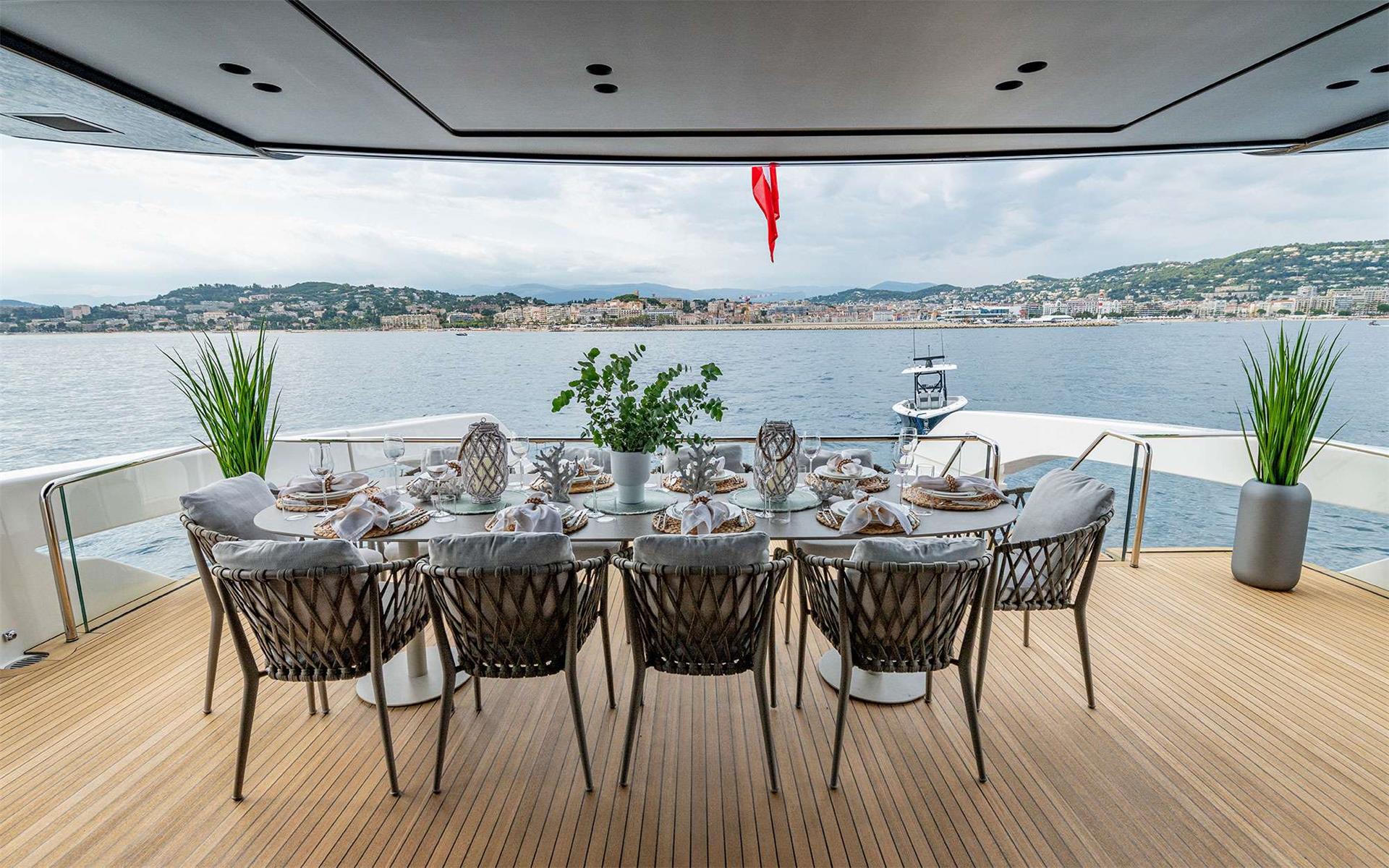 Moving up to the enclosed flybridge, guests have the option for windows down with sunroof slats open as an outside feel with semi-al fresco dining or choose to enjoy the view in a protected, air conditioned environment.