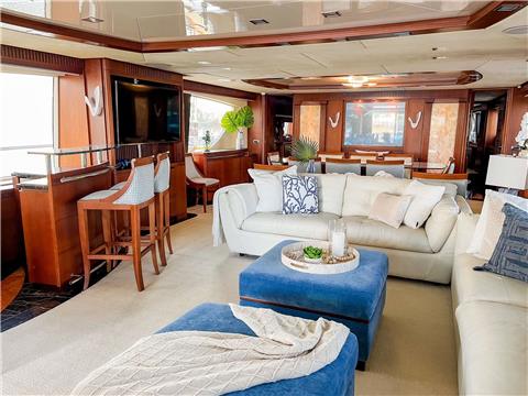 The main salon boasts large windows, light carpets, neutral furnishings, and cherry wood creating a luxurious and classic atmosphere. Relax in the full bar area, sofa, armchairs, ottomans, and entertainment center. The formal dining area is situated just forward with seating for up to 12 guests.