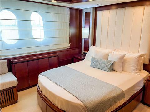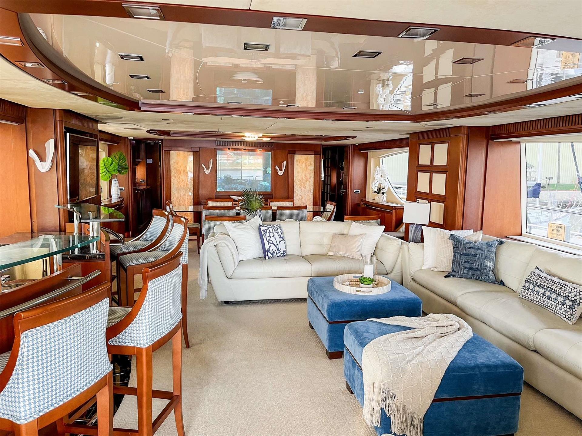Spacious Main Salon with full bar area and entertainment center, formal dining forward seating up to 10 guests with custom glass panels. Main Deck: full walk-around to large high bow with upper and lower sunpads, aft deck seating for 10 w/ wet bar and TV. Master King forward on Main deck with large windows, ensuite marble bathroom, Jacuzzi tub, separate shower.