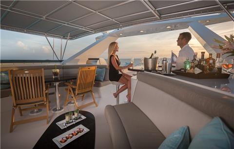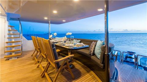Aft Deck: New Quartz stone table dining table with settee and chair seating for up to 12 guests. Converts to a 4' x 10' dining area. A spiral staircase leads to the sundeck. Access to the large teak swim platform that offers lots of room for watersports set-up, with shower and ladder.
