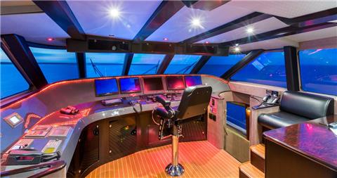 Accessed via the Wheelhouse. New On-deck 5 person Jacuzzi. Sun and shaded areas with brand new eisenglass enclosure forward to provide protection from the wind; a wet bar, refrigerator, commercial ice maker and wine fridge. New BBQ grill. Settee seating area with quartz table. Four STIDD helm chairs with new upholstery for great viewing while underway.