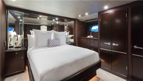 Master Stateroom: Located below deck amidships, accessed via the guest foyer. Full-beam with King bed. His and hers closets. Full beam bathroom with bidet and large walk-in shower. Shower has two large shower heads, one is a rainfall and one is a waterfall. 50" Panasonic flat screen TV/Apple TVs. Minibar and wine fridge.