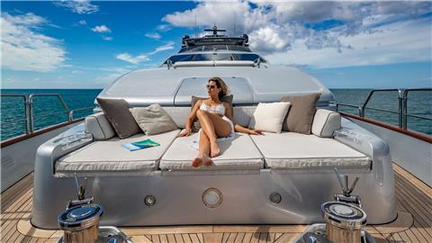 TAIL LIGHTS features numerous comfortable outdoor lounging and al fresco options from the bow, fly bridge to the aft deck.