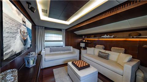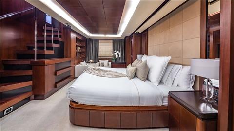 Owner's private master suite is fully separate with a private staircase leading below amidships with King size bed, sitting chairs, small self-service bar, and safe. The large en-suite bathroom has bathtub and separate jet rain shower, twin sinks.