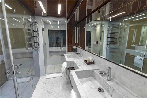 The Full-beam Master Suite is located on the main deck with King size bed (facing forward). Two walk-in cedar-lined closets. Sizeable 49" Apple TV and mini-iPad for A/V control. Vanity and ample storage. Master bathroom countertops and floors are finished in Carrara marble; large glass doors separate a large walk-in shower, and premium features include a mirrored glass wall and towel heater.