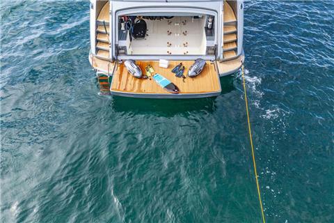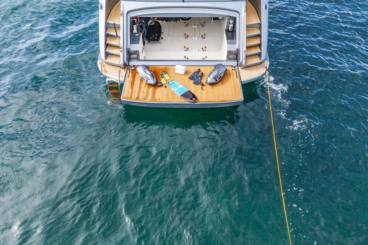 The expansive sundeck provides a great area for entertainment, offering lounge spaces and a wet bar. Alfresco dining is found on both the main deck aft and the covered flybridge. Another great feature on this vessel is the hideaway jacuzzi located on the bow which can be closed away from sight and used as a seating area, or opened up for use to truly enjoy la dolce vita!