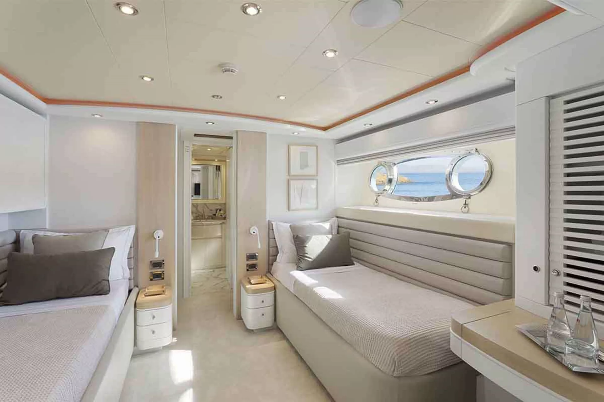 - 2 VIP cabins with queen beds (1,90m x 1,60m) + TV + music + en-suite bathrooms + closets + safe + desk + A/C