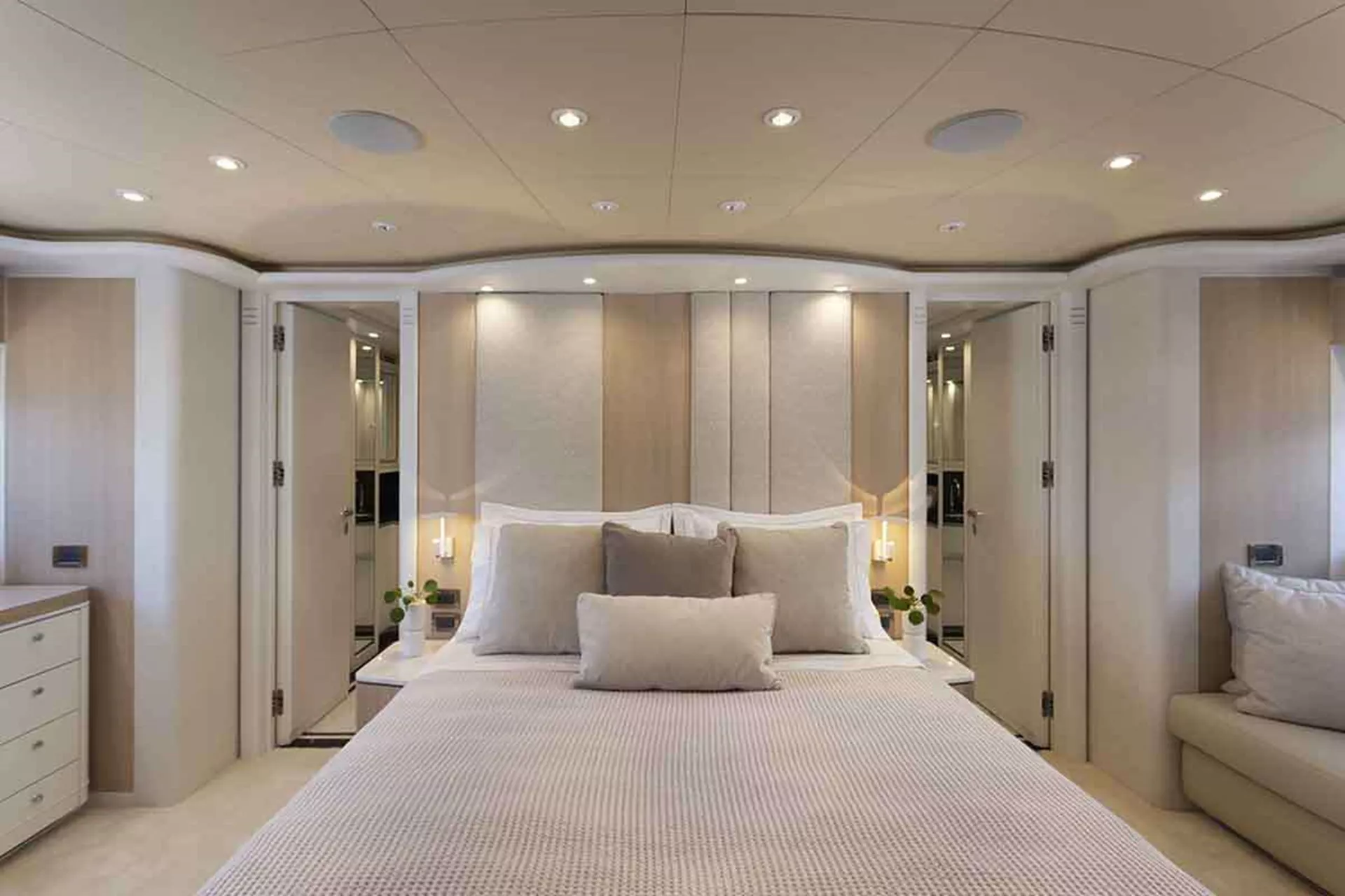 - 1 master cabin king size bed (1,80m x 2,05m) + TV + music + en-suite bathroom with his & hers sink + safe + walk in closets + office desk + A/C