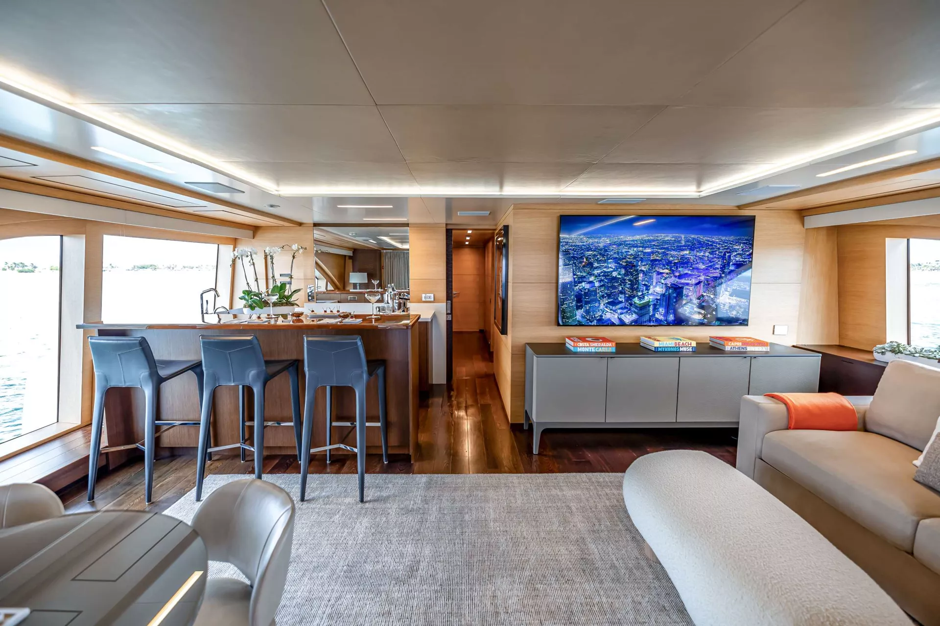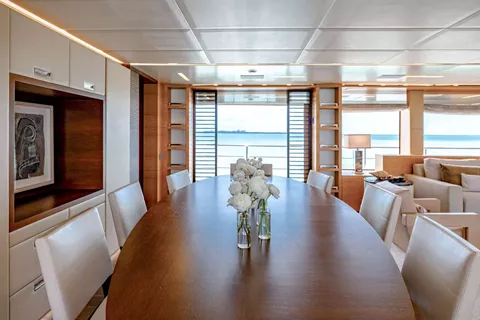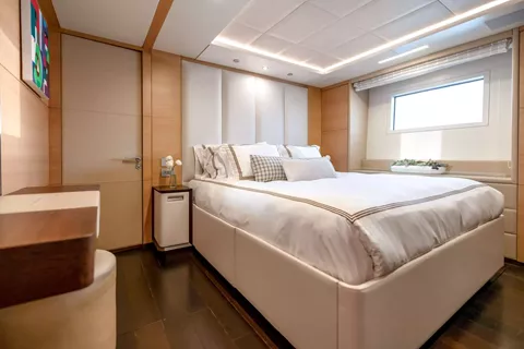 The master is forward and features all the luxuries you could want, including a private office, foldout private balcony, walk-in closet, and a large ensuite with a soaking tub and separate shower. Four guest cabins are below deck and are comprised of two double cabins and two twin cabins, all with their own ensuite.