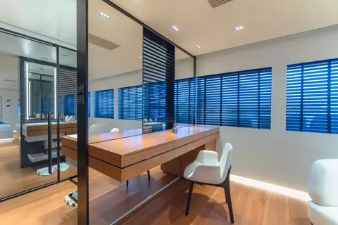 SPACECAT's Master is on the main deck forward, with access to a semi-private exterior terrace of full-beam width.