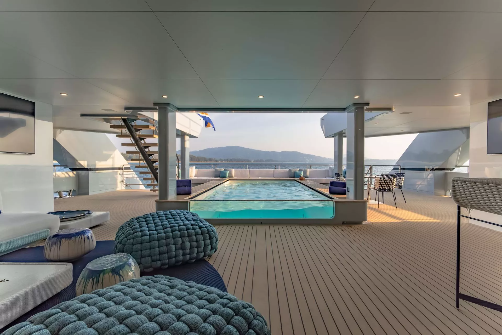 SPACECAT has three decks with vast entertainment and dining spaces, including a spectacular 5.5m/18' x 2.8m/9' pool on the main deck aft with cozy seating around.