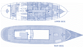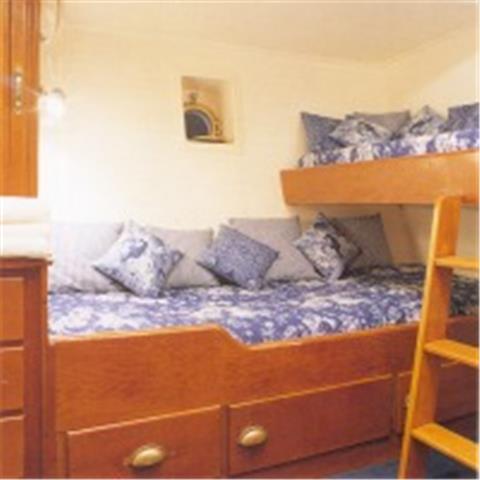 Accommodations include 1 double-bedded cabin, 4 identical cabins (each with 2 berths). 3 bathrooms. Galley fully equipped (new 1992), 3 refrigerators. Air-conditioning system, individually controlled from each cabin. Stereo system with CD. Color TV, video, games. Fully equipped bar in Saloon / Dining room. Sports & Leisure