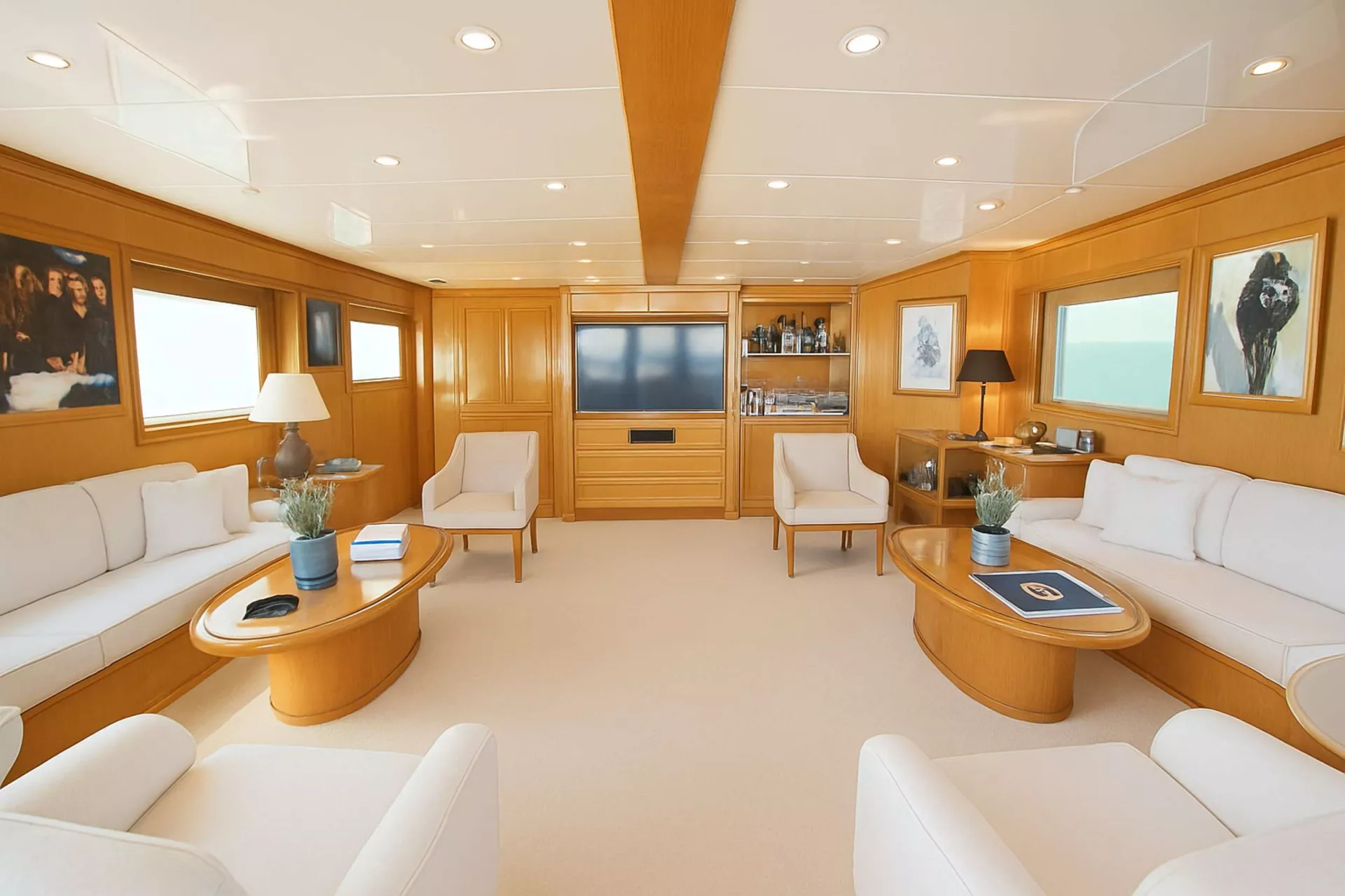 ARKTOS accommodates 10–11 guests in five beautifully appointed cabins, each with an en suite bathroom, including one Full-beam Master Suite with walk-in closet, desk, and mini-fridge, 2 VIP double cabins, 1 twin cabin, and 1 twin cabin with a Pullman berth. All staterooms feature Smart TVs, Bluetooth speakers, mini-fridges, and safes. Refined wood accents and soft olive tones create a warm, elegant atmosphere.