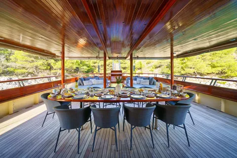 Antonia describes her cooking style as Mediterranean fine dining with a twist—using fresh, seasonal, and local ingredients as a foundation, enhanced with a touch of contemporary flair. Her priority is tailoring her dishes to the tastes and desires of her guests. She takes pride in artfully decorating plates, paying special attention to the selection and presentation of desserts. Thanks to her close ties with local fishermen, it’s no exaggeration to say that the fish served onboard often goes straight from the sea to Antonia's kitchen.