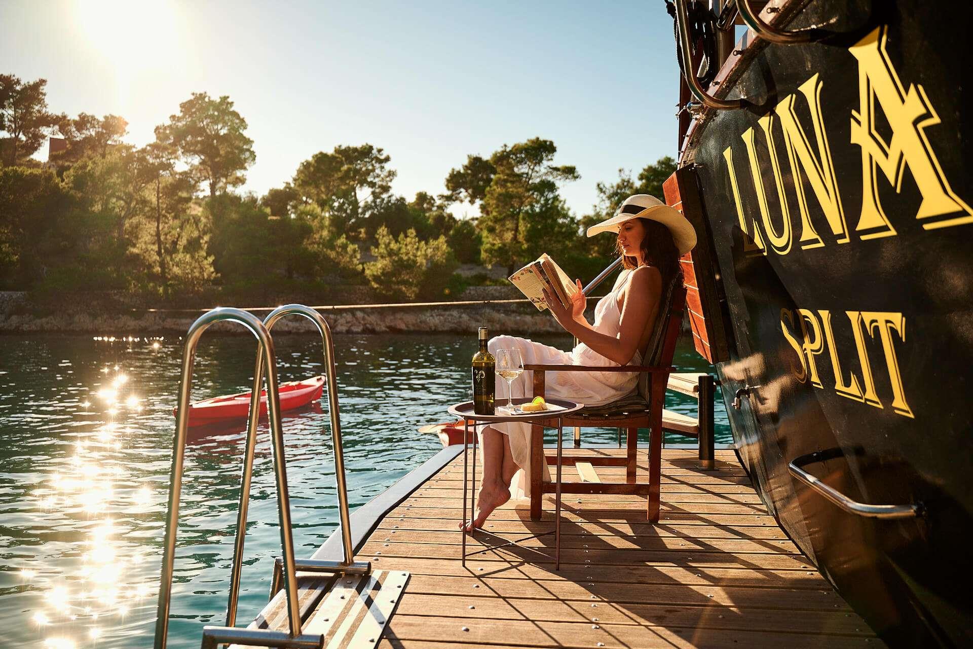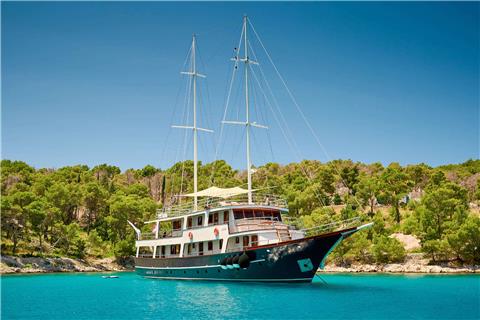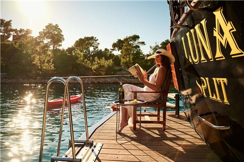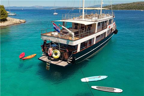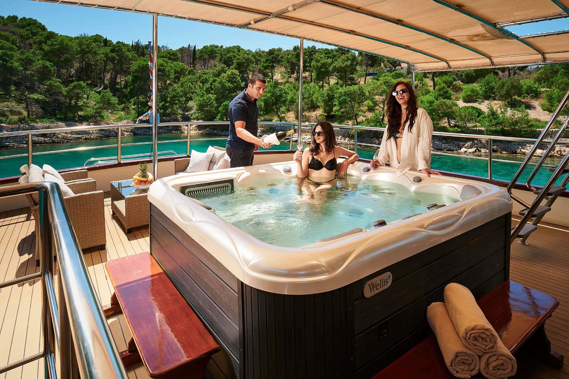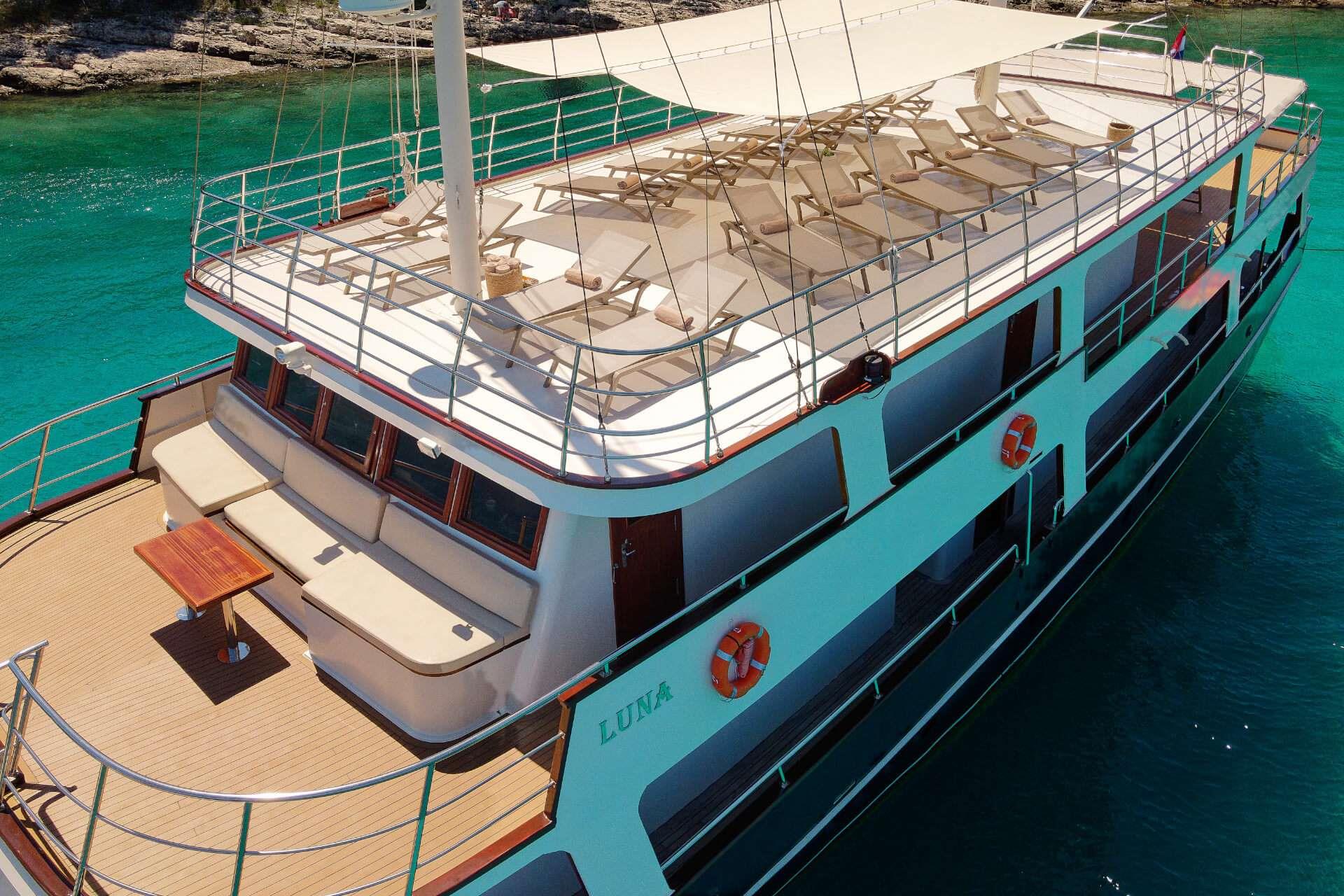 M/S LUNA has been an incredibly popular choice with mid to large groups for cruising the Croatian Coast for years. Why? Because she represents incredible value! Beautiful polished woodwork, luxurious spacious cabins, a full-length top sundeck, and a giant jacuzzi all for a little more than 1,200 Euros per person per week..!