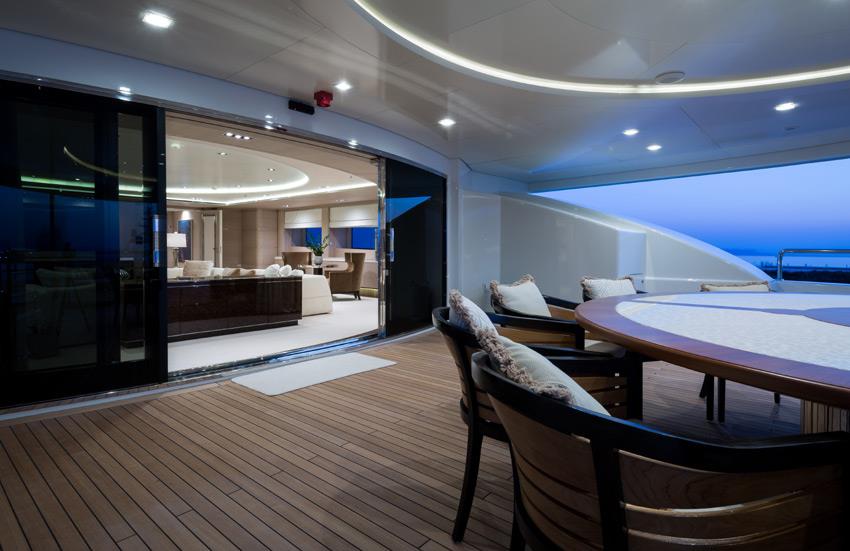 • Two large salons, on main and upper deck, with large sliding doors that connect the salons directly to the aft outdoor deck areas uniting the interior spaces with the exterior.