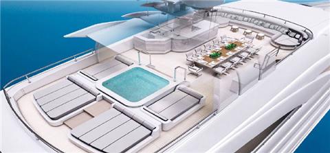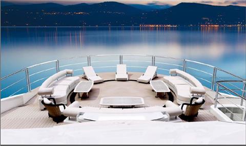 The large exterior decks offer stunning, uninterrupted sea views, thanks to the low bulwarks and to the absence of volumes that are interposed between the outer and inner space. The Sun Deck provides a full range of facilities for outdoor relaxation including a generously sized spa pool, surrounded by comfortable sun beds, full-width settee forward, shaded dining area for sixteen guests, full bar with BBQ. The Bridge Deck offers Helipad for touch and go for helicopter sizes like the MD 500E (6 guests). On the Main Deck, the aft outdoor lounge area features a comfortable settees’ arrangement which makes it the perfect meeting point for guests to enjoy a magnificent view, in broad daylight or at sunset.