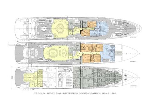 • Three master cabins: One forward at Main Deck, full-with with balcony; the second is located forward at the Upper Deck with panoramic views forward and direct access to the exterior; and the third is at the aft bridge deck with stunning views towards the stern and private exterior deck.