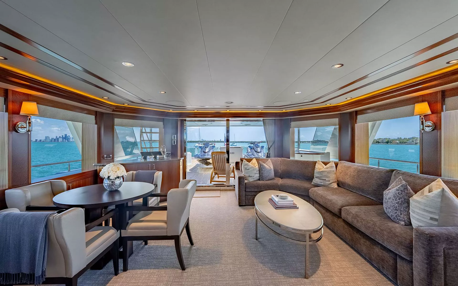 Aft on the main deck, a vast welcoming space with settee, dining and crescent bar.