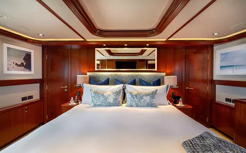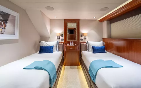 Featuring 5 guest staterooms for up to 10 guests including an on deck Master suite, two VIP cabins with King beds and two twin cabins on the lower deck.