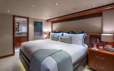 The on deck Master stateroom has a large en suite with privacy toilet + bidet, lighted make-up mirror and large marble accent shower. Generous dressers and walk in closet for his/her and safe.
