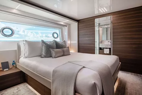 EROS features a Main Deck Master Stateroom with an ensuite, and also with a seating/ office area. Below deck you can find 4 other staterooms. Forward port stateroom is a fixed queen, and forward starboard is a fixed twin stateroom. Aft there are 2 more staterooms that are convertible from a queen into two twin beds or vice versa.