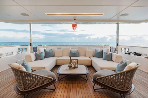 Step aboard EROS, a breathtaking 121-foot tri-deck motor yacht from Custom Line that masterfully blends timeless Italian design with modern luxury. Launched in 2019 with a beautiful refit in 2023, EROS offers an exceptional charter experience for up to 10 guests in five spacious and stylish staterooms. The full-beam master suite is located on the main deck and features its own private office and lounge area, while the lower deck hosts a versatile mix of queen and convertible staterooms, perfectly suited for both families and groups of friends. The yacht’s open-plan living spaces are flooded with natural light thanks to expansive panoramic windows, creating a serene atmosphere throughout the main salon and sky lounge.