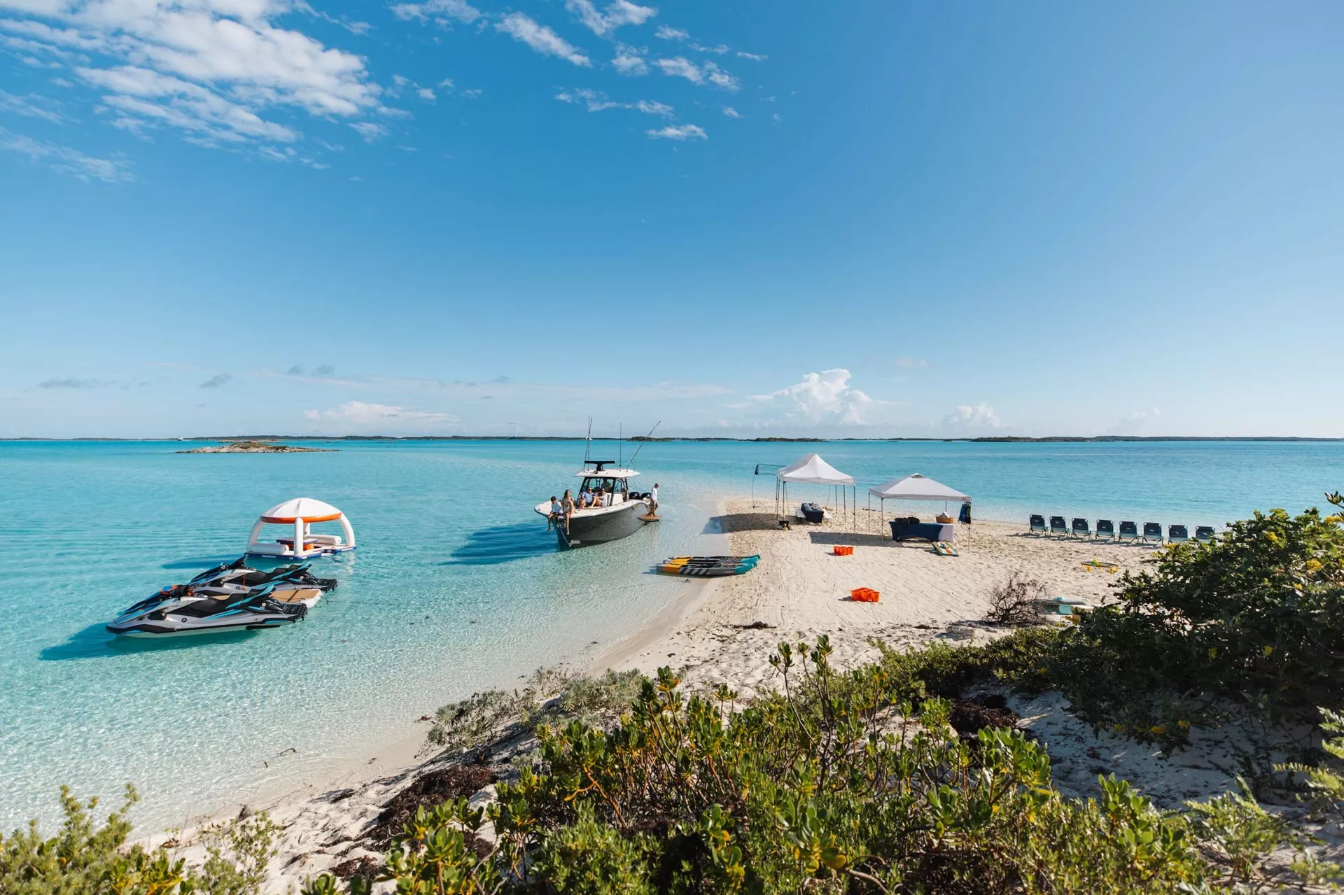 Guests can make their way up to TCB’S vast sundeck for fun in the sun. On this level, an alfresco gym provides guests the ability to keep their workout routine while on board with an arrangement of equipment at their disposal. A large six-person Jacuzzi invites guests to soak in the shade. The charter yacht’s deck space is large enough for guests to move around comfortably. Large built-in double-facing sunpads and sun loungers ensure guests will be in complete comfort while sunbathing, and optional shading is available when desired. TCB’s full complement of water toys will do the trick for those seeking a little exhilaration. TCB’s plethora of water toys are readily available for each guest’s enjoyment. Easy access to water toys is available from TCB’s extended swim platform and docking system making the switch from ski’s to wave runners a breeze. No matter the group, guests of all ages will find that TCB and her experienced, charter savvy crew exceed expectations.