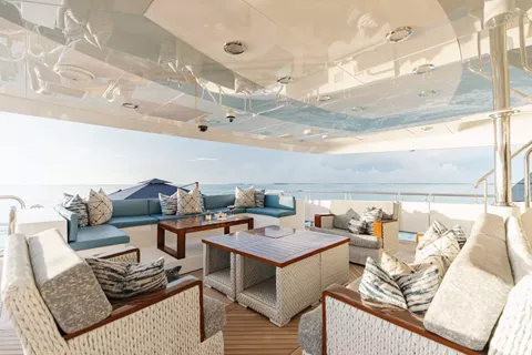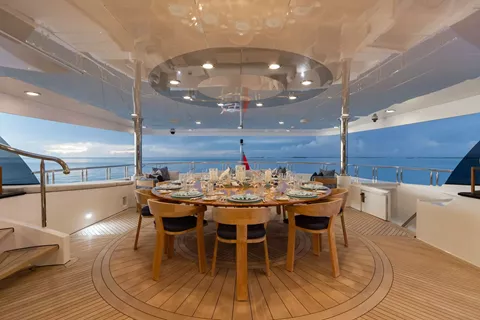 Accessed by a grand central staircase, charter guests will find the stunning skylounge, complete with self-playing baby grand piano, fireplace and full bar surrounded by unbeatable views. The 75-inch TV offers top-of-the-line entertainment with Apple TV, a Kaleidescape movie system with more than 1,800 movies and the latest video gaming systems. The large L-shaped sofa invites guests to sink in and unwind after a long day on the water. Aft of the skylounge is the beautiful alfresco dining table for 11, complete with a breathtaking backdrop of the surrounding scenery.