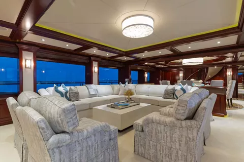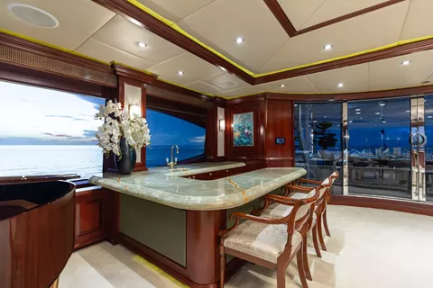 Located aft of the pilothouse featuring a large wet bar with seating for 4, designer Mahogany wall treatment, desk, large settee, fireplace with TV above mantle. Day head located forward.