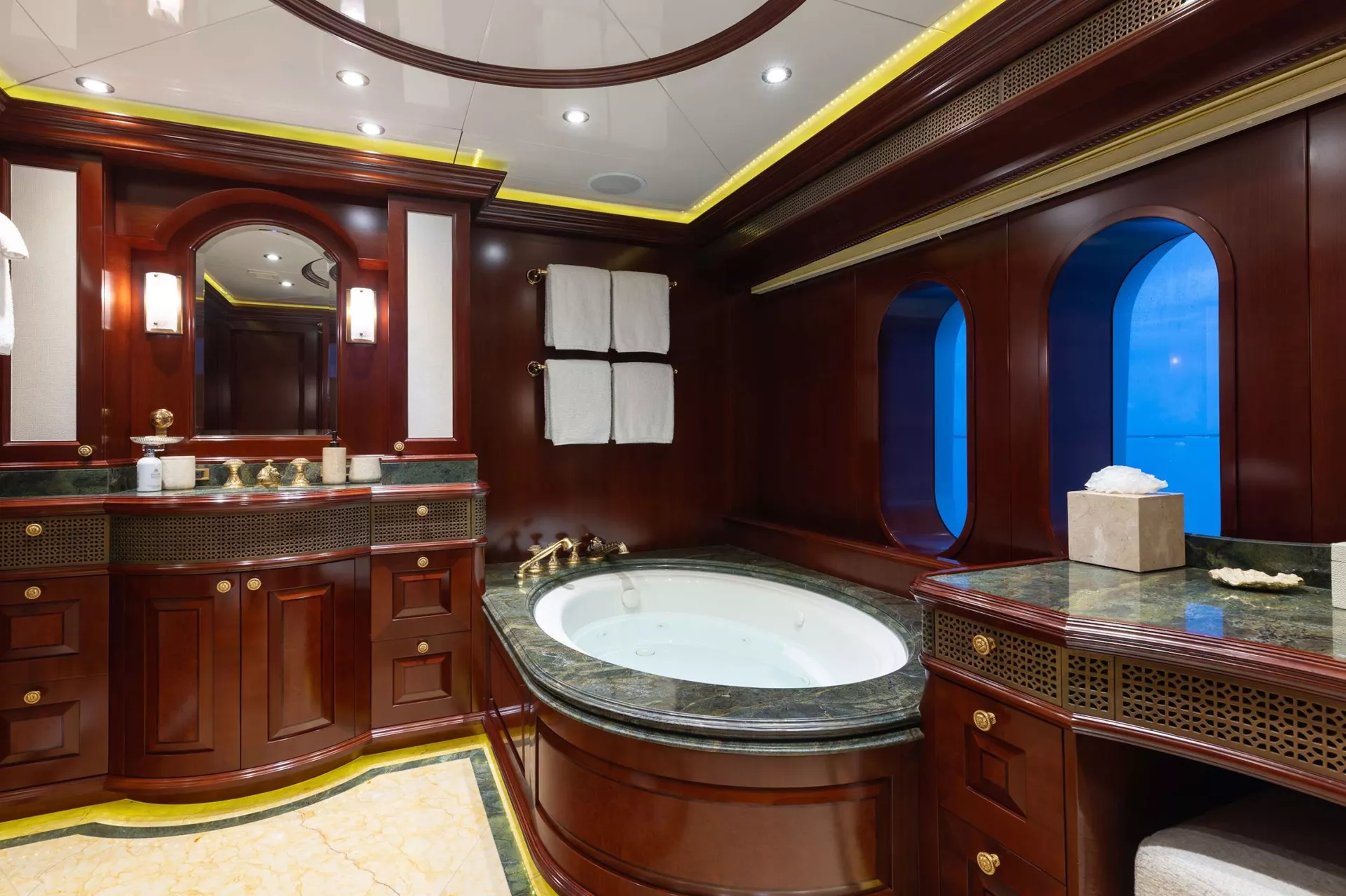 TCB accommodates up to 11 guests to spend restful nights in her five beautifully-appointed staterooms. The full-beam, split-level master suite is ideally suited for privacy. 180-degree views can be seen from the upper level, giving this space a flow of natural light. A unique feature of this stateroom is the intimate lounge on the lower level, perfect for taking a break from the action and unwinding in seclusion. A large his-and-hers en-suite is accessed through the lower level lounge and features a large Jacuzzi tub, vanity and shower. TCB’s additional accommodations include four en-suite staterooms on the lower deck, comprised of three king-size staterooms and one twin stateroom with a Pullman, perfect for accommodating small children. Each stateroom onboard showcases elegant styling as seen throughout the yacht’s interior.